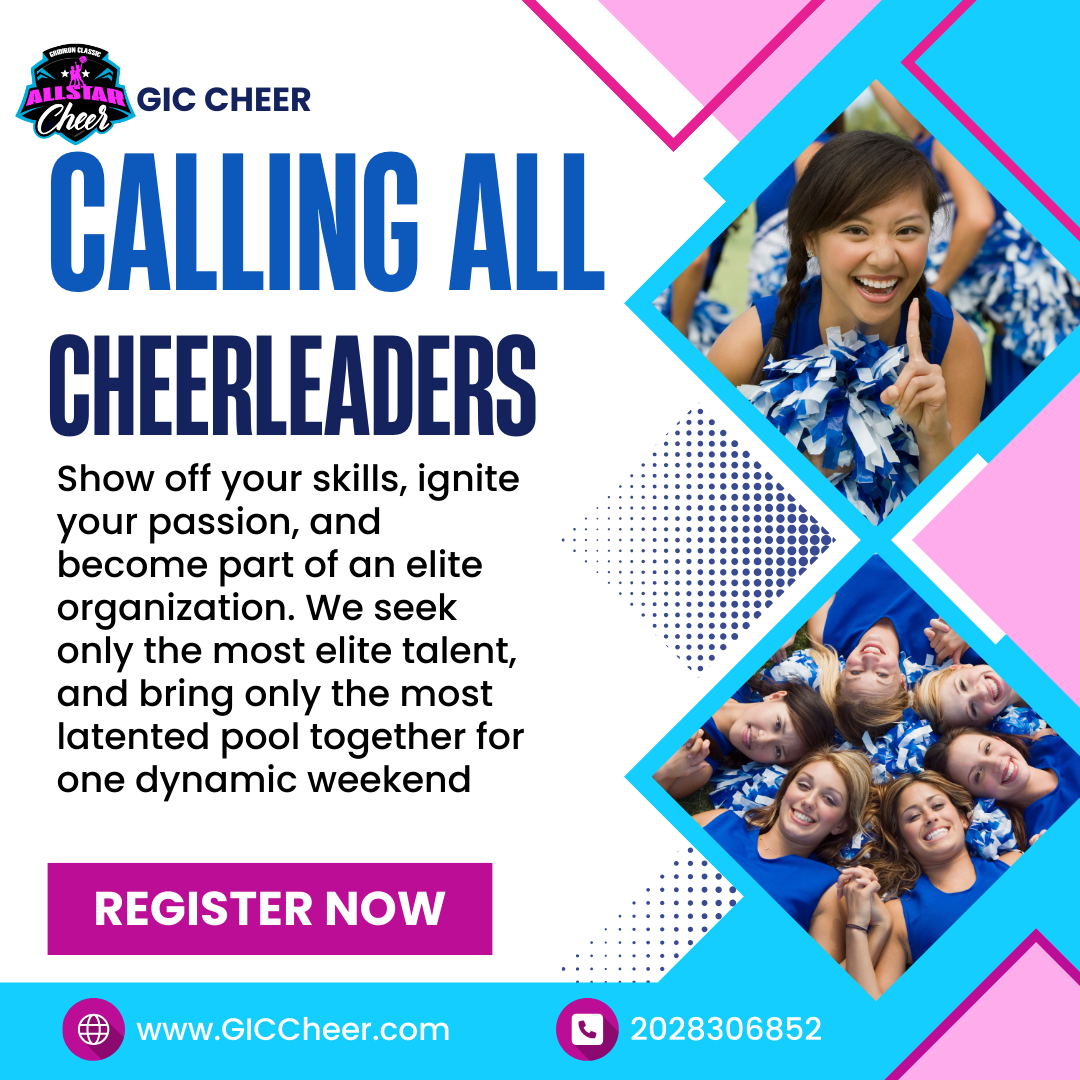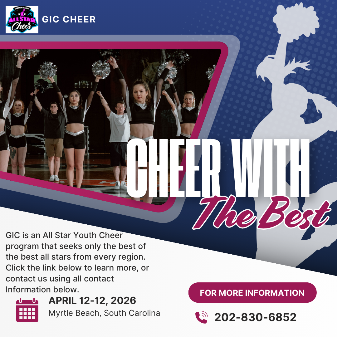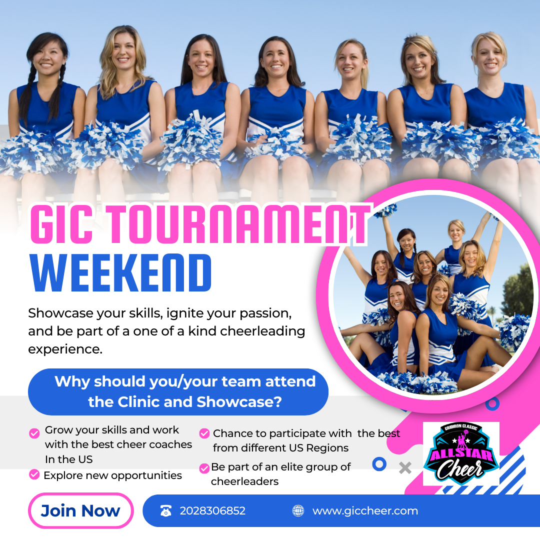 Tournament WeekendCongratulations — you’ve been selected! Pack your bags and meet us in Myrtle Beach, SC, April 9–12, 2026, for the GIC All-Star Weekend. During this unforgettable experience, you’ll train at an exclusive All-Star clinic led by top industry cheer coaches, learn a dynamic routine, and shine on the biggest stage of all: the largest youth All-Star Game halftime show in America!