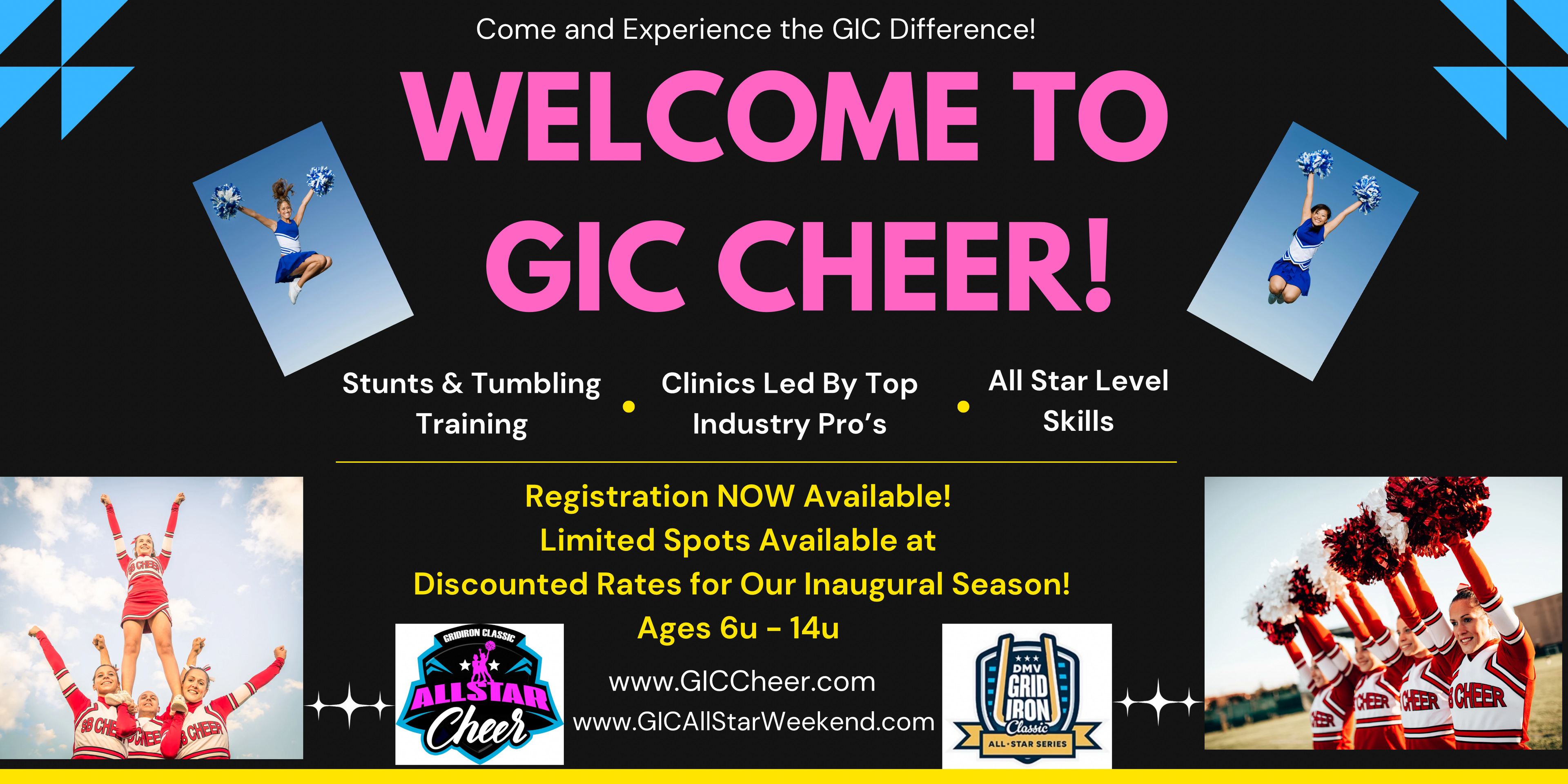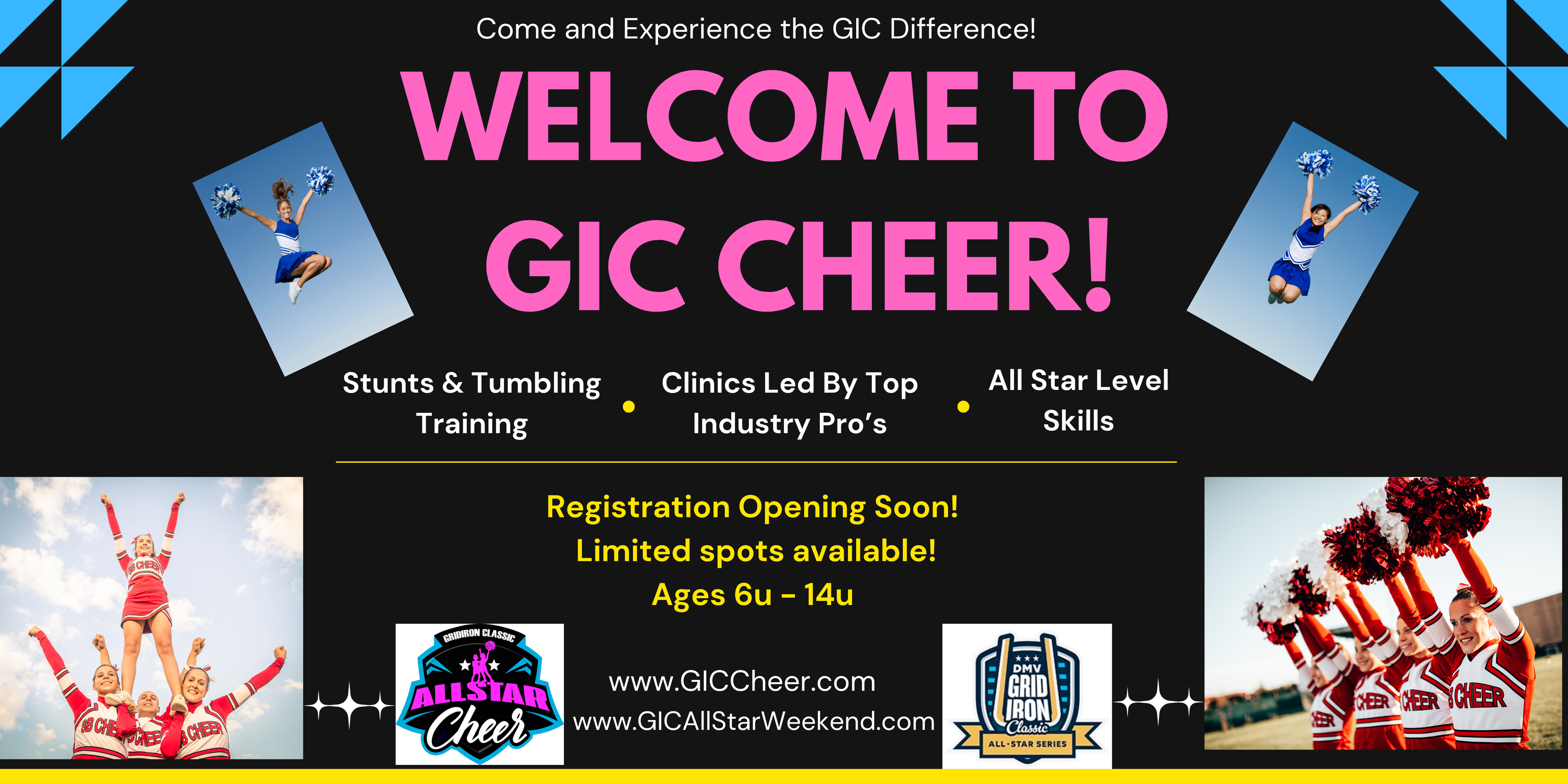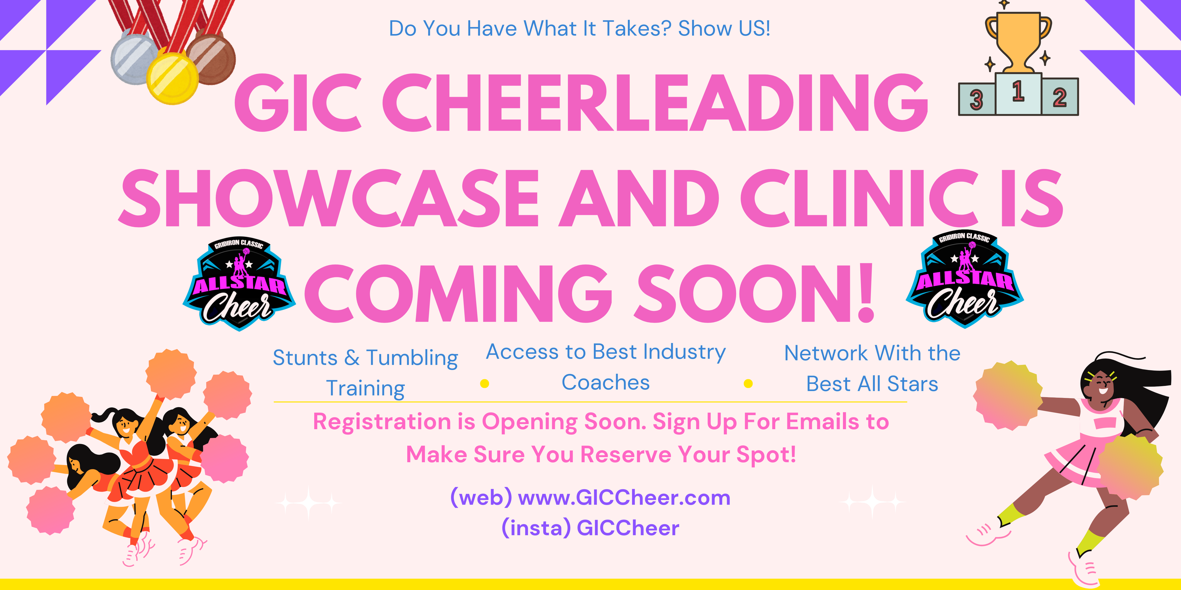 Tournament WeekendCongratulations — you’ve been selected! Pack your bags and meet us in Myrtle Beach, SC, April 9–12, 2026, for the GIC All-Star Weekend. During this unforgettable experience, you’ll train at an exclusive All-Star clinic led by top industry cheer coaches, learn a dynamic routine, and shine on the biggest stage of all: the largest youth All-Star Game halftime show in America!