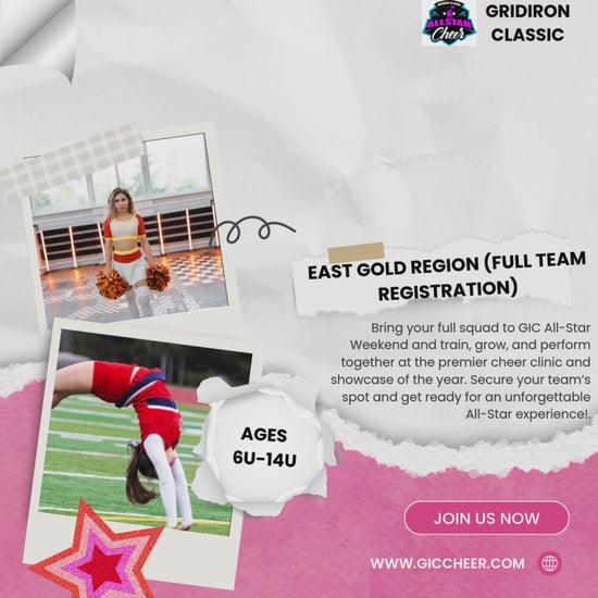 Your entire team has been selected to represent your region or organization during the GIC All-Star Weekend! This registration option allows you to enroll your full roster under your organization, ensuring that your established cheer team can participate together in the GIC Cheer Clinic and All-Star Showcase.