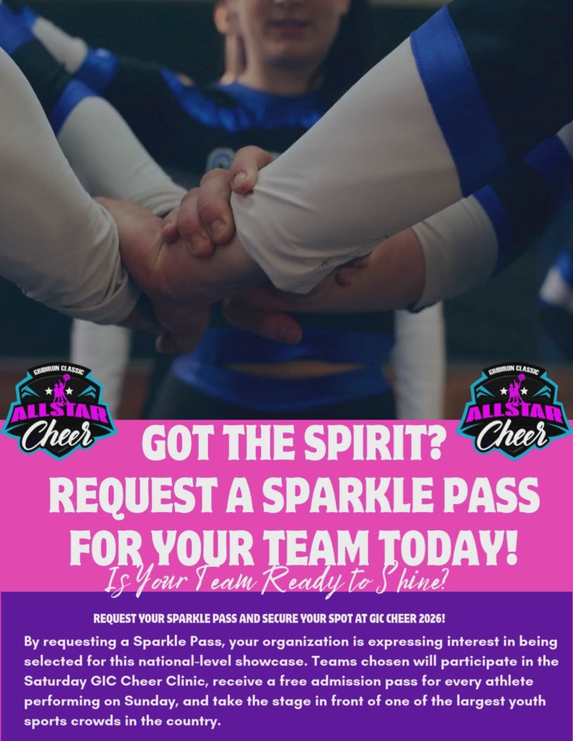 By requesting a Sparkle Pass, your organization is expressing interest in being selected for this national-level showcase. Teams chosen will participate in the Saturday GIC Cheer Clinic, receive a free admission pass for every athlete performing on Sunday, and take the stage in front of one of the largest youth sports crowds in the country.