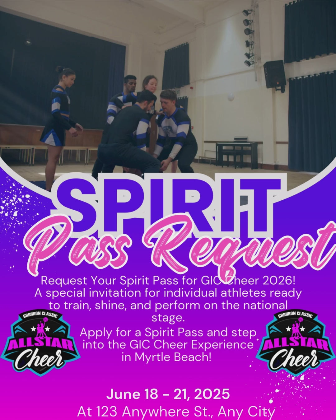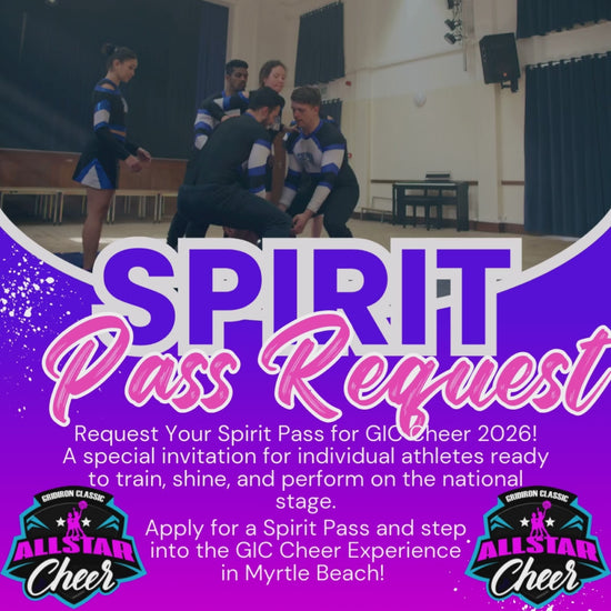 Unlock your opportunity to join the 2026 GIC Cheer Experience in Myrtle Beach! The Spirit Pass is our exclusive invitation for individual cheerleaders who are interested in participating in the GIC Cheer Clinic and performing during the GIC Championship Halftime Show. This pass is perfect for athletes who may not be attending with a full team, but still want to train, shine, and experience the excitement of GIC Cheer.